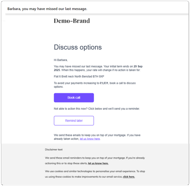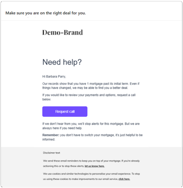 These start sending 6.5 months from the expiry date of a clients mortgage. If they have multiple mortgages due in the same window they will be consolidated into one communication. They send monthly from 6 months and continue up until 60 days post expiry, unless a state change occurs.